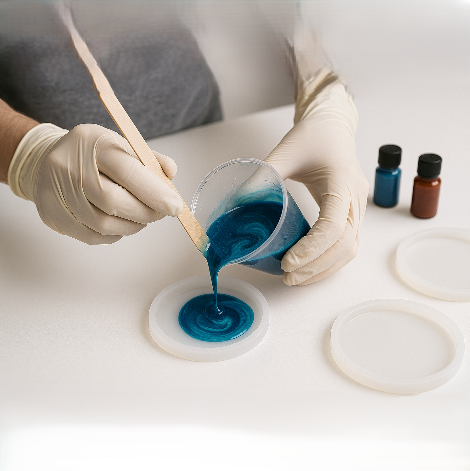 Add your chosen pigments drop by drop. Remember, a little goes a long way with resin pigments.